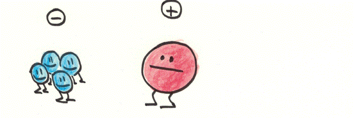 Dans la matière, on trouve des atomes qui sont composés d’un noyau et d’électrons. On dit que les électrons ont une charge négative et le noyau une charge positive.