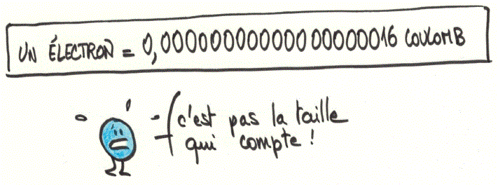 Dans l’autre sens ça donne 1 Coulomb = 6240000000000000000 électrons, c’est à dire la quantité d’électrons traversant un conducteur parcouru par un courant d’intensité 1 Ampère pendant 1 seconde (1 Ampère Seconde).